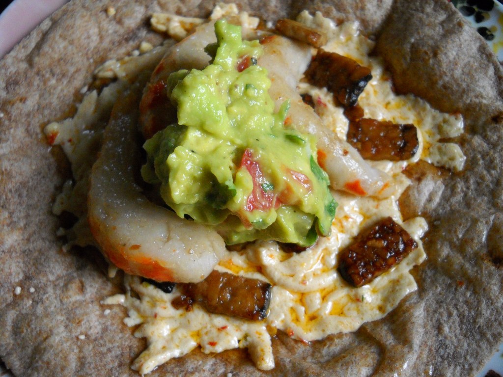 So, firstly, you’ll want to saute your tempeh bacon and vegan shrimp in a tiny amount of oil, really you don’t need much. Then, assemble your dilla. Layer your tortilla of choice with the cheeze, then layer your shrimp and tempeh….and if you’re a weirdo like me….put your guac into the quesadilla as well. I know, I know….you’d think you’d top a quesadilla with guac after it’s already cooked, but I like it inside with the melty cheeze and other goodies. Once you are done assembling, throw your quesadilla on the stove top and melt away, or you can do this in the microwave as well.