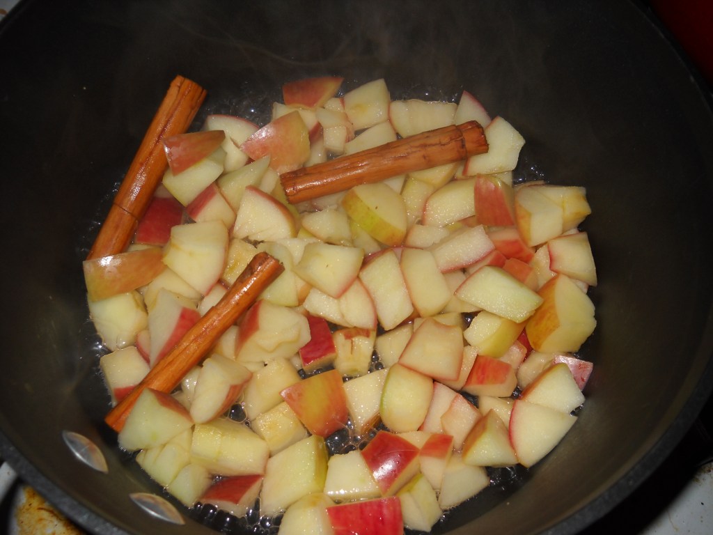 I had a leftover bottle of brandy from when I made Brandied Cranberry & “Beef” Stew. With all of my new found information on applejack and apple brandy, I decided to make something along those lines. I combined some organic white wine, brandy, cinnamon sticks, a touch of sugar and a bunch of apples that I picked last week with a friend.