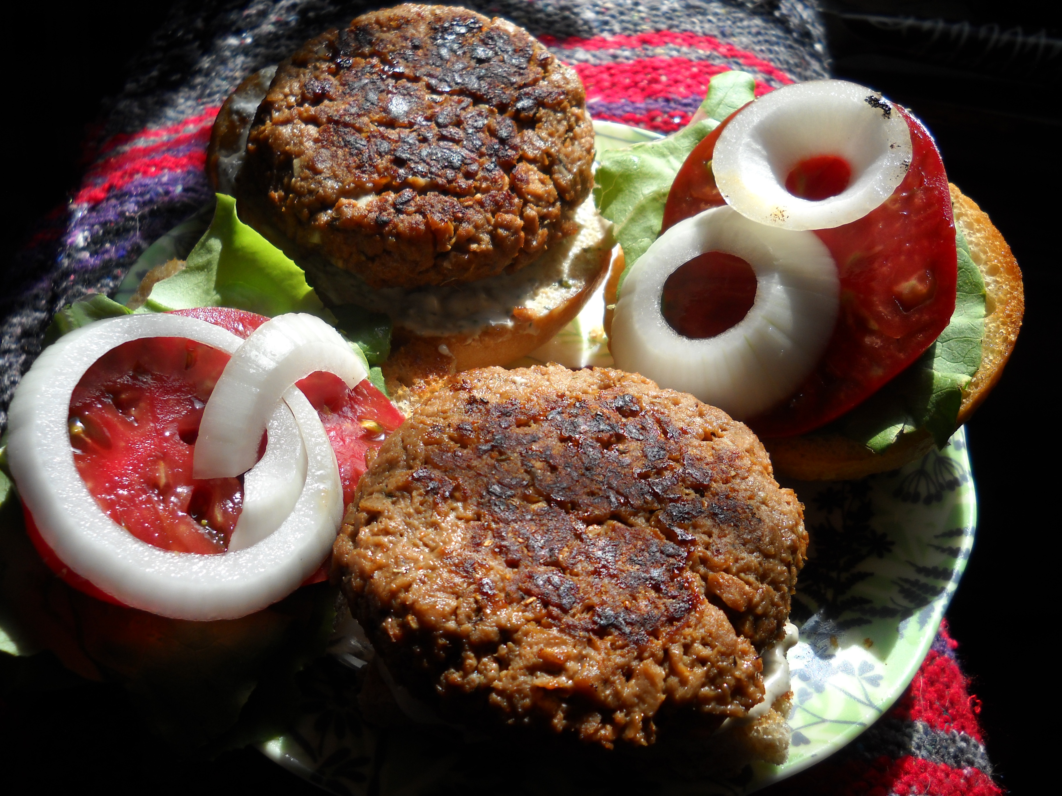 I wish I had a shot of the inside of the burgers so you could see the cheeze stuffing, but I couldn’t get an appetizing slash decent picture. I also made some green peppercorn mayo for these and just went with traditional burger incidentals.