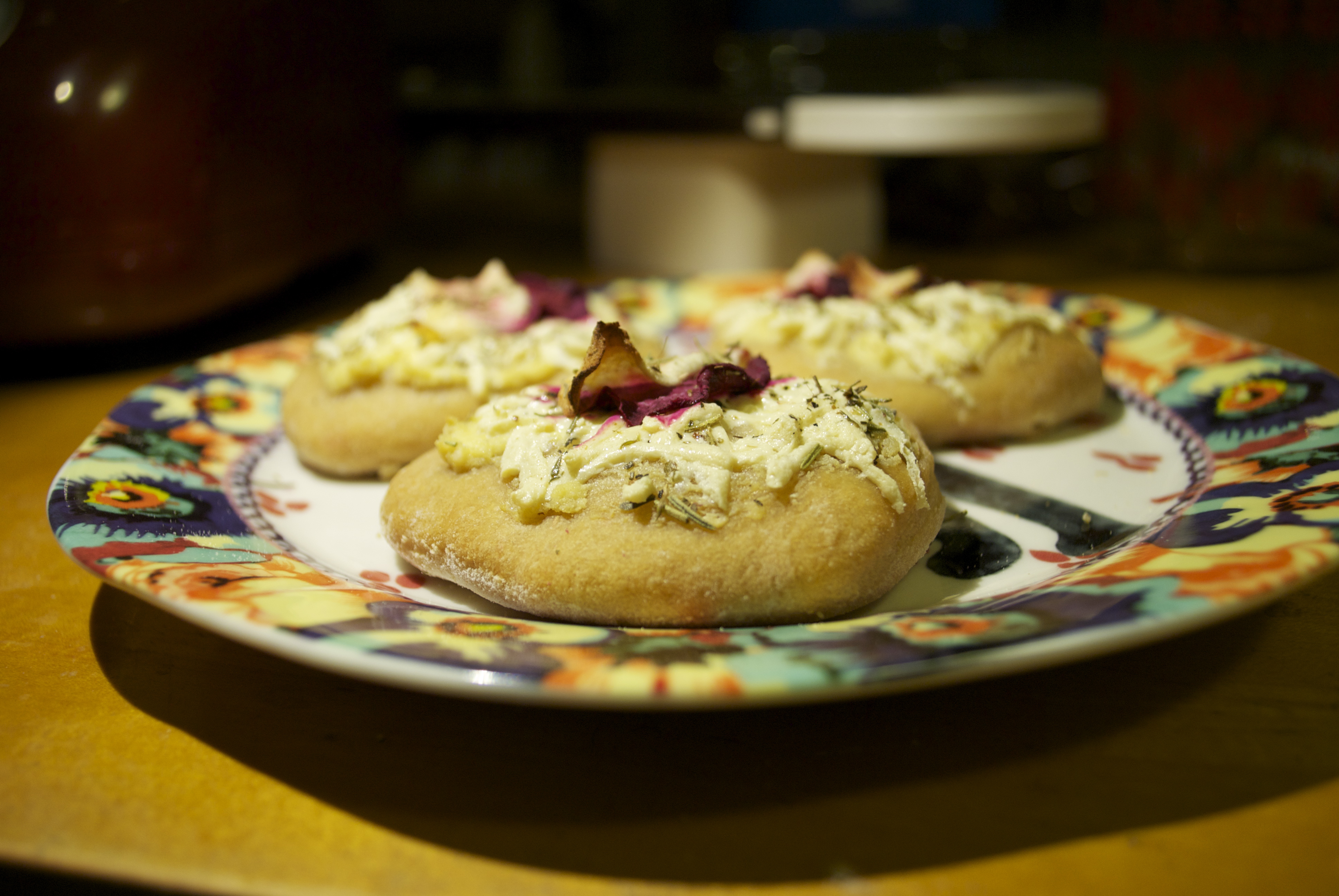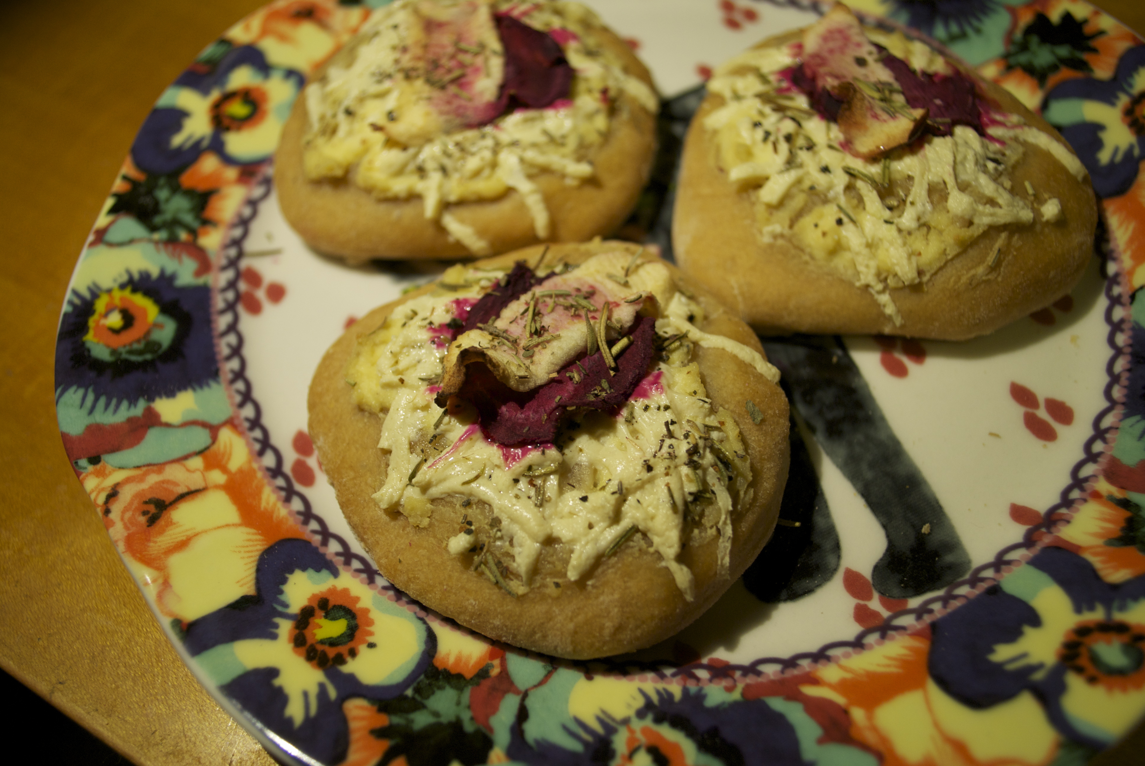 Roll out your dough into a big circle. Using a biscuit cutter or pint glass turned upside down, cut out as many dough circles as you can. Spread some vegan fontina or ricotta onto the circles. Top that with some Daiya shreds. Sprinkle on some herbes de provence and then top each pizette with a sliced beet and apple. Sprinkle on more herbes de provence if you please. Place pizettes on a pizza stone or baking sheet sprinkled with cornmeal. Bake about 12 to 15 minutes until Daiya is melted and dough starts to turn golden around the edges.