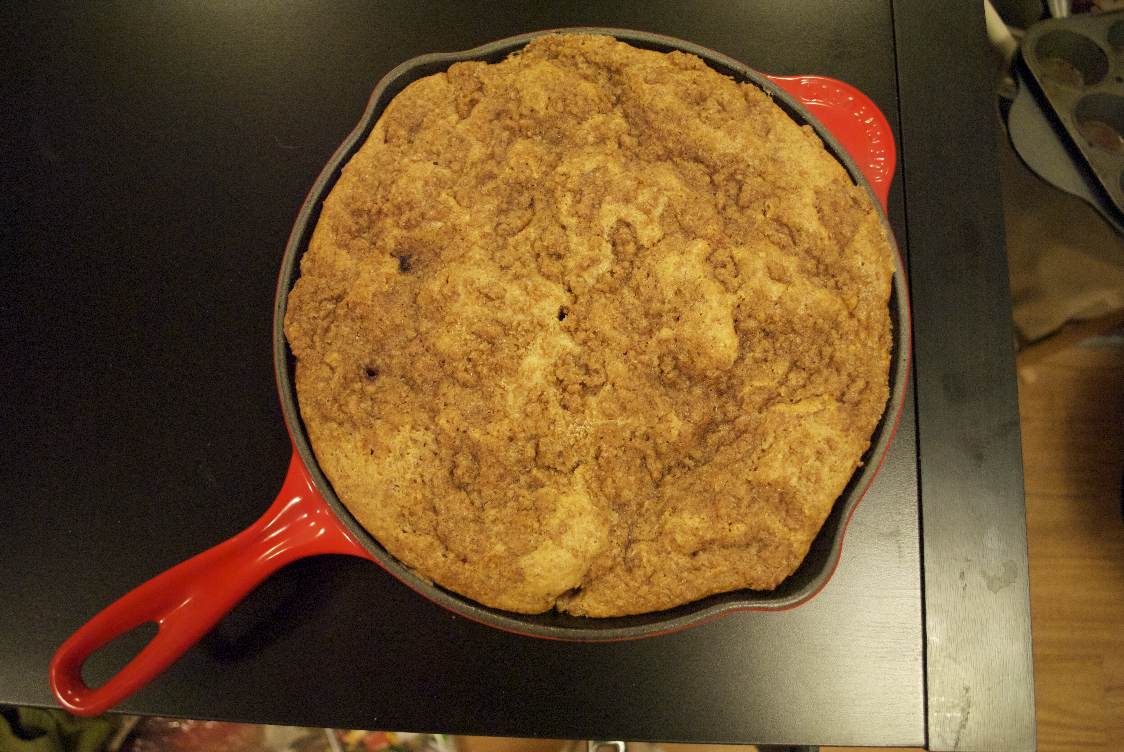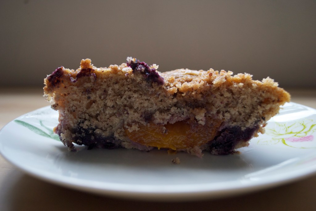 The buckle is easy. Just roast your peaches with tempeh bacon and a drop or two of liquid smoke per Irvin’s instructions found here on his original post. Make the topping listed on Irvin’s site, subbing out the butter for Earth Balance and omitting the salt. For the cake, I just used the buckle recipe from Vegan Pie in the Sky, which is great. Don’t bake according to those instructions though, as they are a little different. You won’t be inverting this buckle as that book instructs you to do. Just use the batter in place of the non-vegan version and voila, BUCKLE in your mouth.
