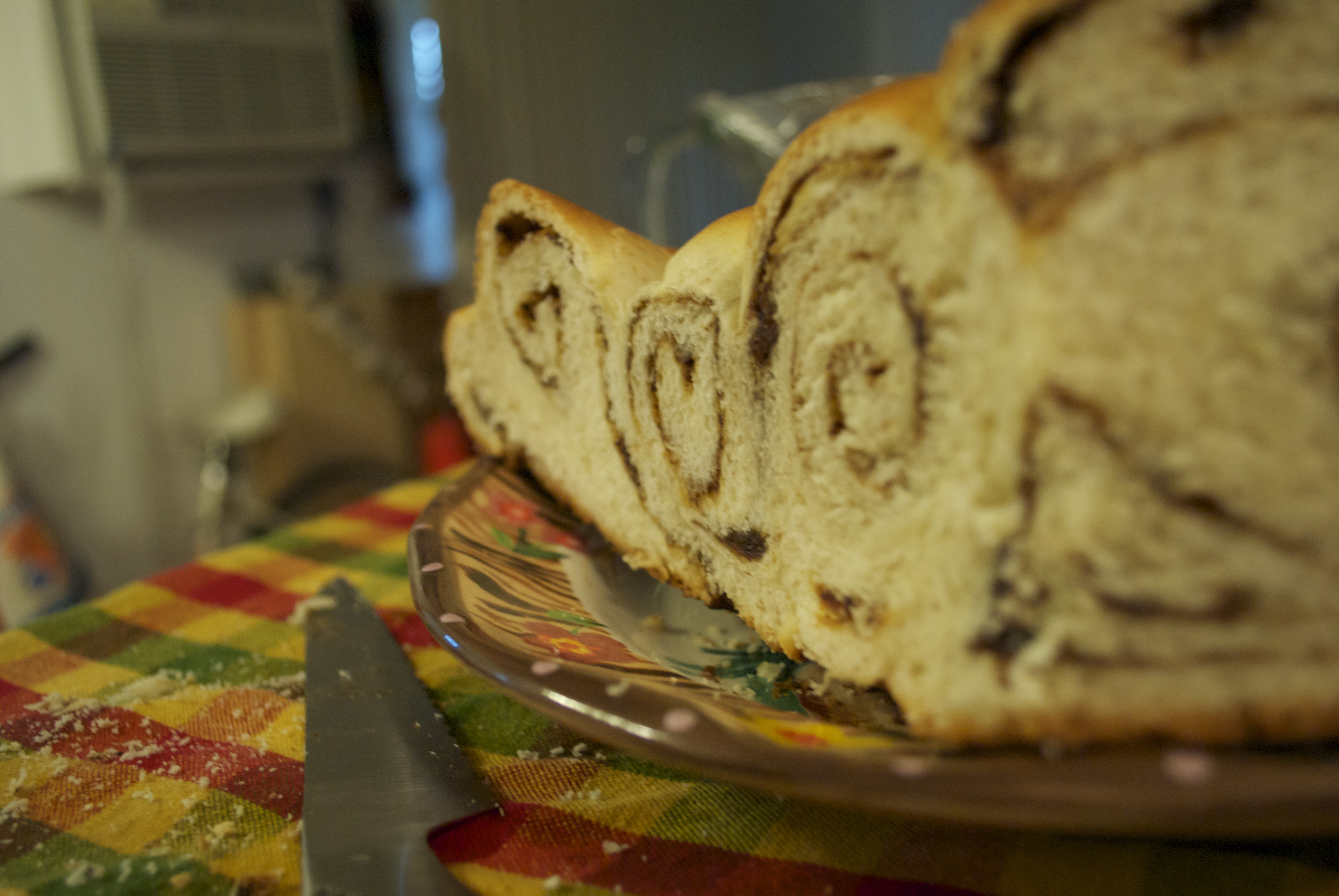 As for braiding, my braid may or may not have been a tad funky. Braiding a traditional long challah loaf is easy, but braiding the loaf into a circle? Damn.