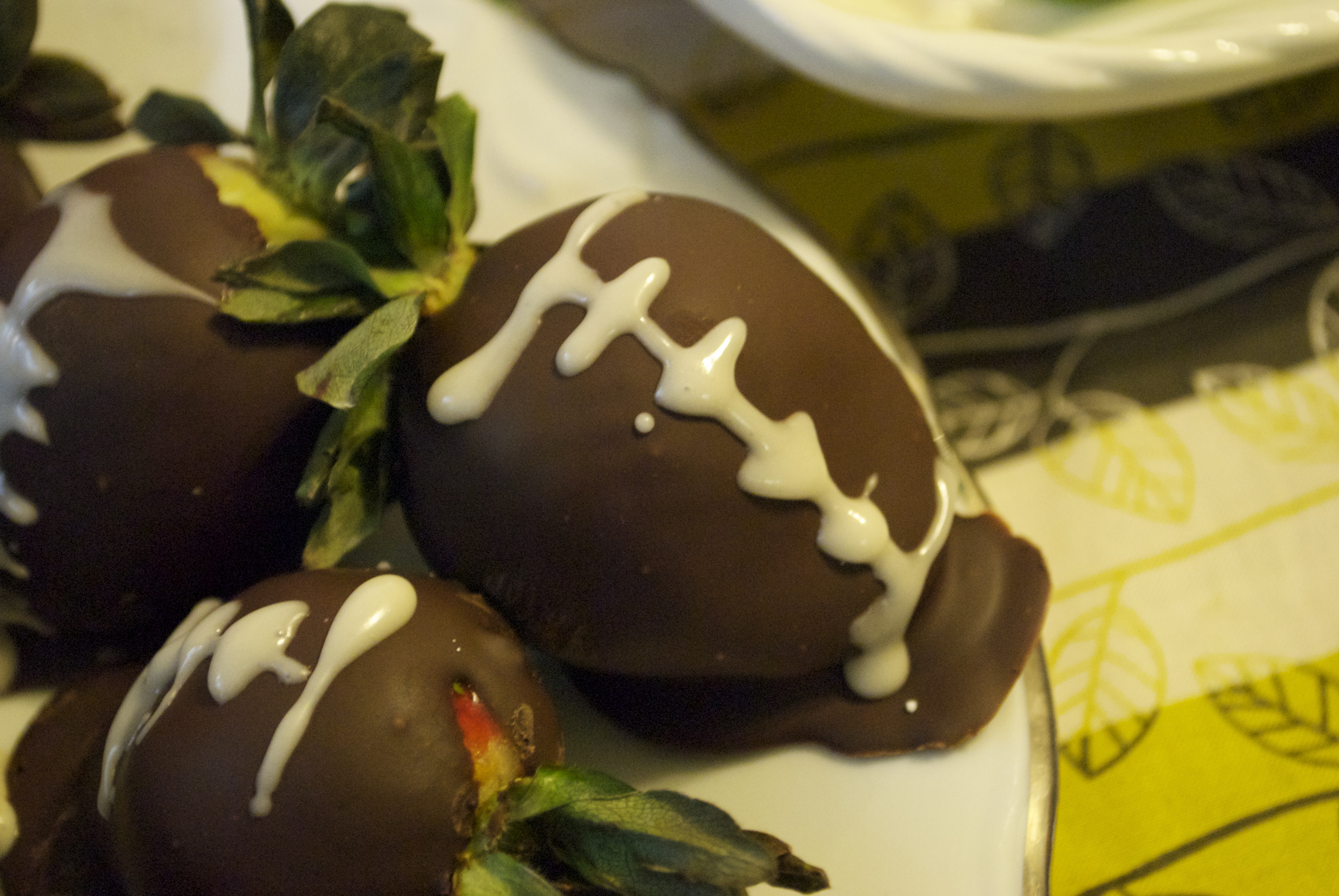 I thought I had this great idea for chocolate dipped strawberry footballs to bring to a Superbowl party. I made a batch of annoyingly runny royal icing, which I still can’t seem to get exactly right. Next time, I will use frosting for better precision with my laces. People still got the idea and seemed to enjoy them, as there were none left.