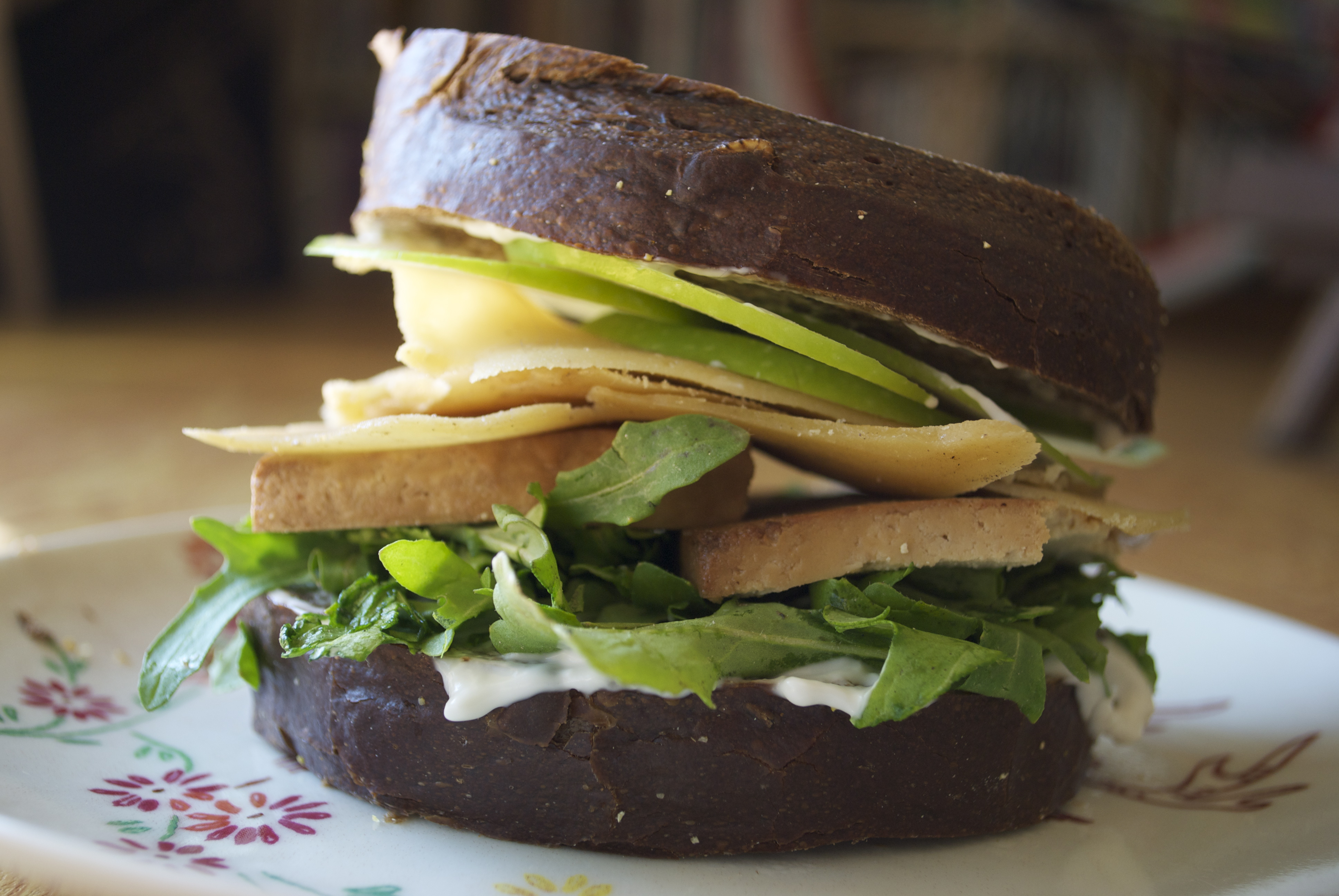 Excellent sandwich, if you’re into sandwiches (who isn’t into sandwiches?). The gouda from Artisan Vegan Cheese is mind-blowing. I’ve heard rumors that it is one of the more difficult cheeses in the book to make, but I had no trouble with it. I used homemade rejuvelac (made from quinoa–I find it easiest to sprout) and I don’t ever have carrageenan hanging around, so I use the agar option with all recipes that call for one or the other. I don’t even have a picture of the two wheels to show you because that’s how fast I ate it. Very cheesey; savory and addictingly delicious. It was great plain or on sandwiches. It was so good cold that I didn’t try melting it. I have made a few other cheeses from the book, some very successful, others not so much. I recommend visiting Miyoko’s website to see which recipes she has provided notes/tips/updates for as she is constantly improving upon these cheeses.
