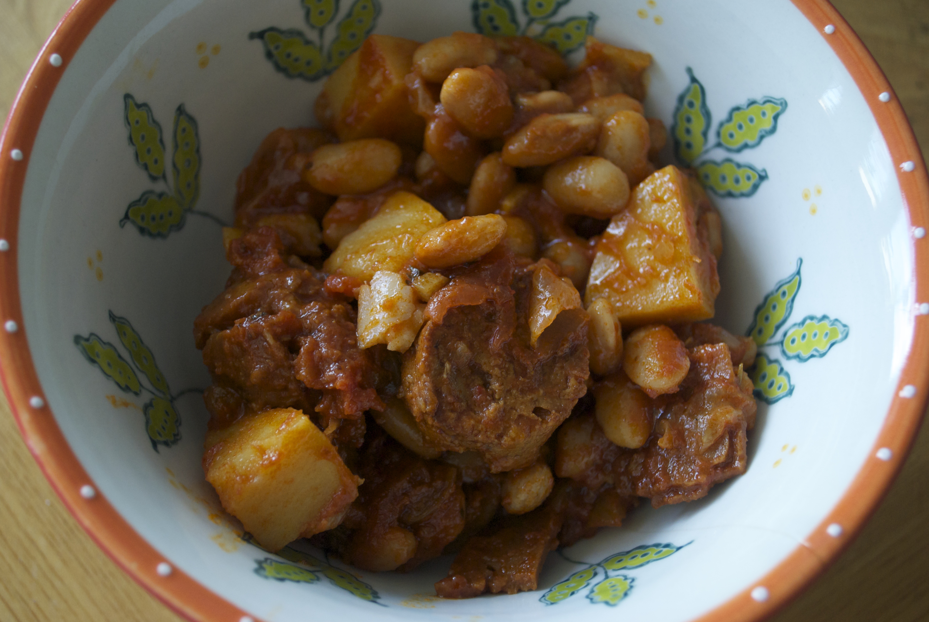 Add more oil to the pot if it needs it. Add the onion and garlic and cook until softened. Then add the tomatoes paste and cook about 30 seconds. Next add the potatoes. Add the cooked dry beans or canned beans. Add all of the remaining ingredients and bring everything to a boil. Reduce the heat until you have a simmer going. Cook until the flavors are melded and the potatoes are cooked through. Use a fork to test the potatoes for doneness. Remove the bay leaf. If you chose to save you Upton’s and Field Roast, add them now and continue to cook for another 5 minutes or so, until they are heated through.