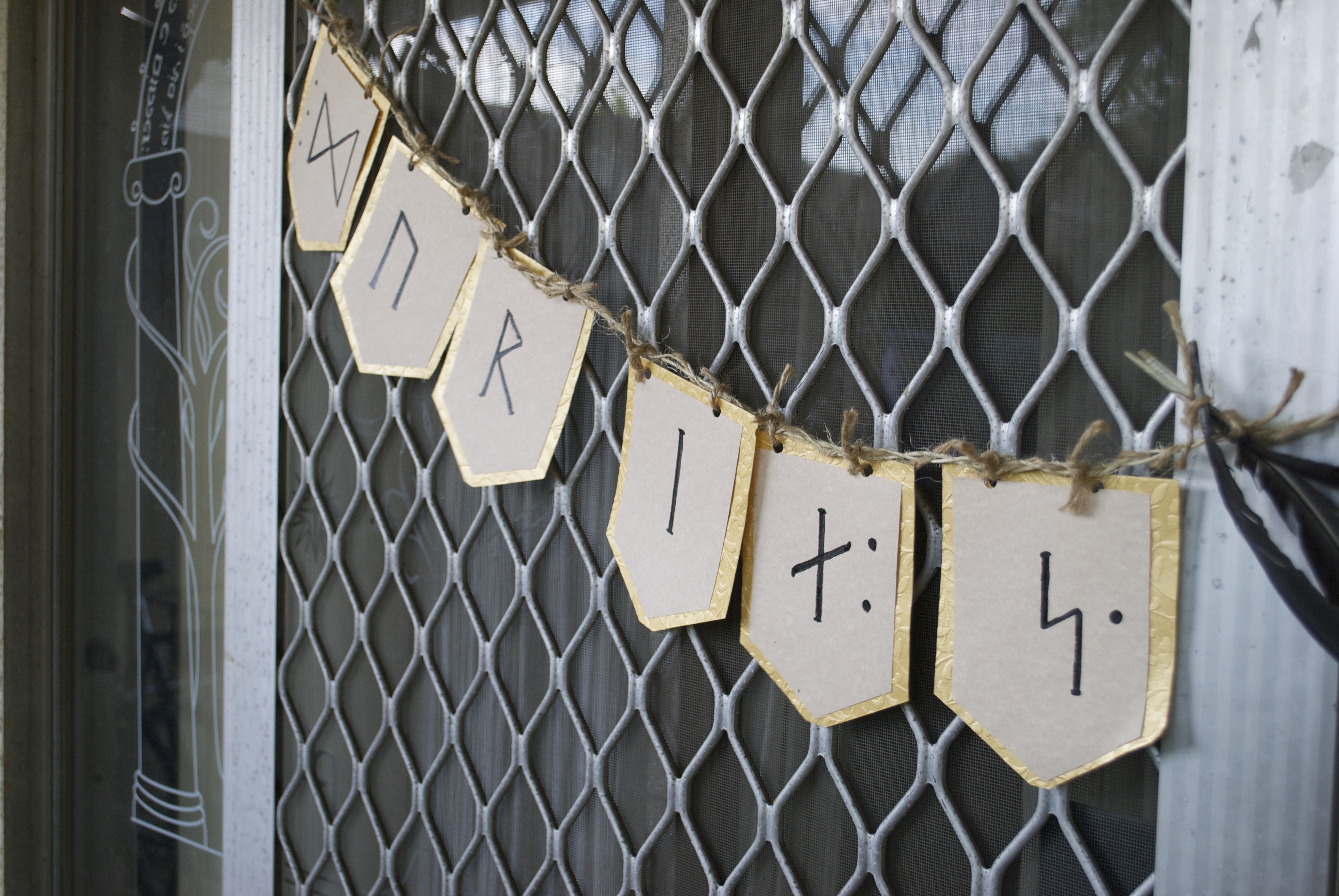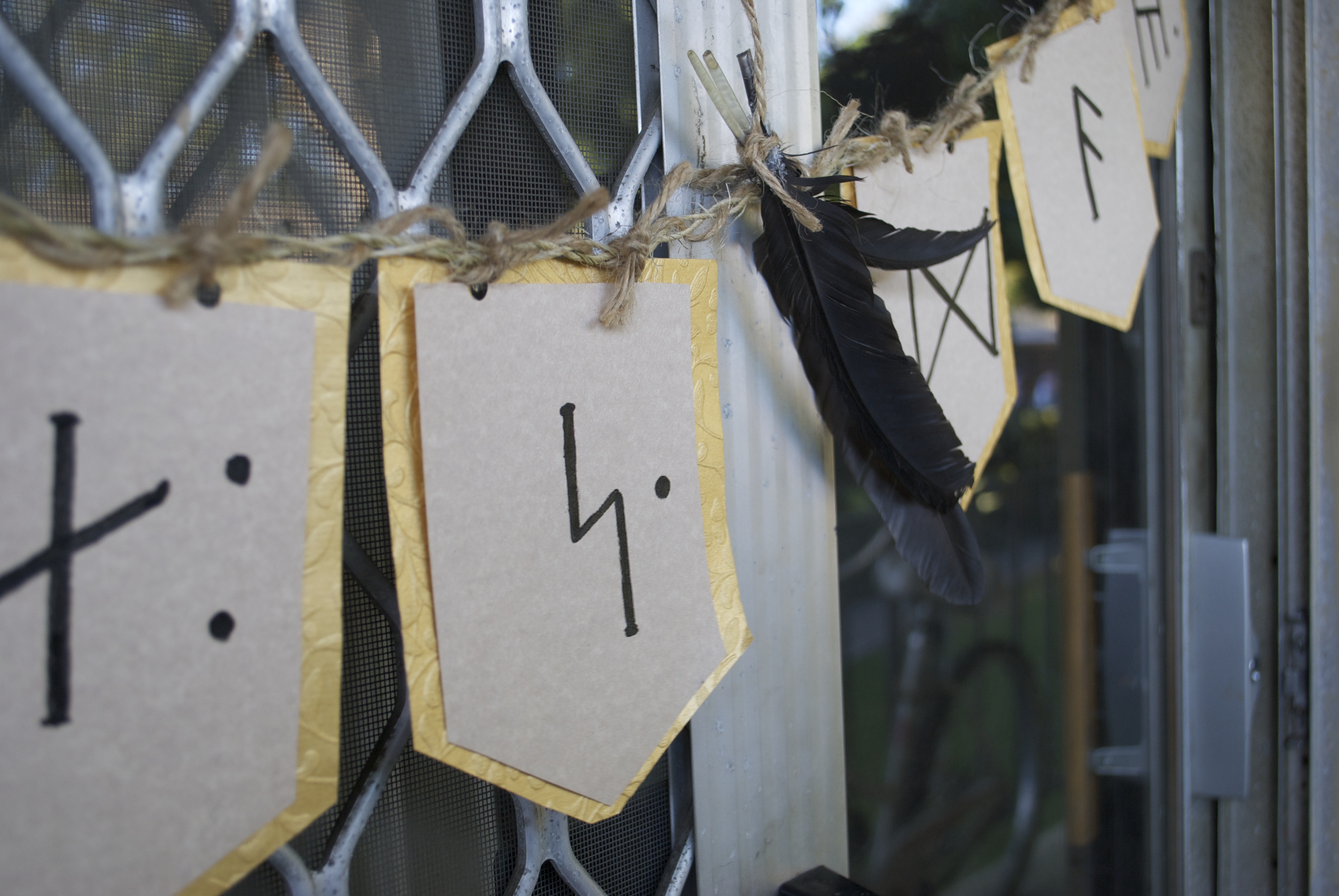 I took my time studying and drawing each rune. Once I finished the word “Durin’s”, I thought I would break up the garland a bit by tying together three clean, black chicken feathers that I collected from a farm visit earlier this year and securing them in between the words “Durin’s” and “Day”. It is just as easy to buy faux feathers from the craft store. I would not recommend using real feathers unless you can make sure that they came from a cruelty free environment and that the feathers are clean, of course. When I was finished with my runes and tying my feathers, I used a hole punch to create two holes at the top of each letter. I used some short pieces of twine to tie each rune to the braided strand that I had made and set aside earlier. I also used a similar piece of twine to tie my feathers on to the middle of my garland.
