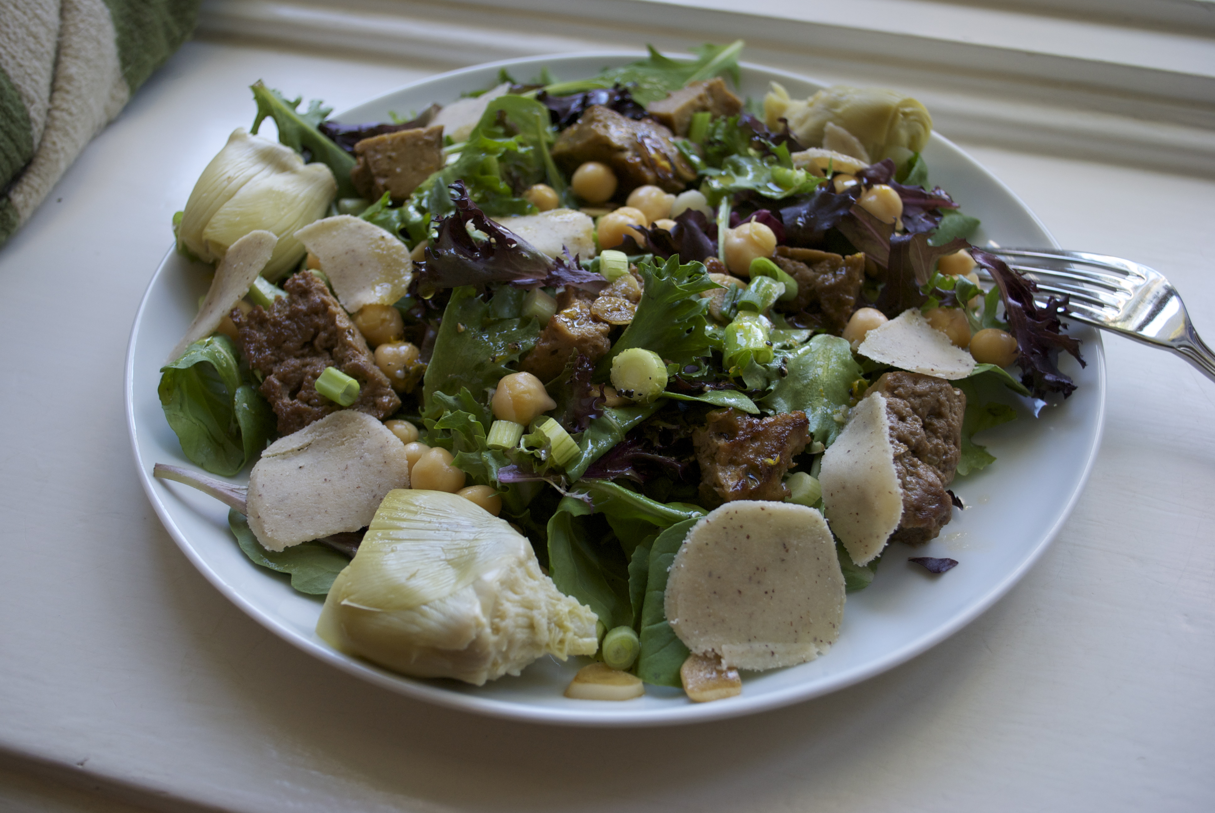 That there salad was a vegan version of a meat salad I saw that looked pretty good. I made some “beef style” seitan and marinated it in fresh squeezed orange juice and garlic. The rest of the salad is sort of a hodgepodge of things; garbanzo beans, artichoke hearts, Dr. Cow, scallions with a citrus-garlic vinaigrette.