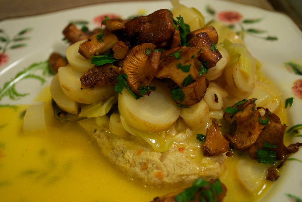 I should have written up a recipe for this one. It’s another adaption of a non vegan dish from Sunset Magazine; Chicken Fricassee with parsley root and chanterelles. Fricassee is a French comfort food and I think it refers to a technique of braising meat. I used Gardein for the chicken and made everything else according to recipe, subbing out any dairy for an awesome non-dairy choice. The sauce was a little bit too sweet (primarily made of white wine) so I think I’d tone it down a bit next time. But when you really got a good bite with a piece of everything on your fork, it was pretty delicious.