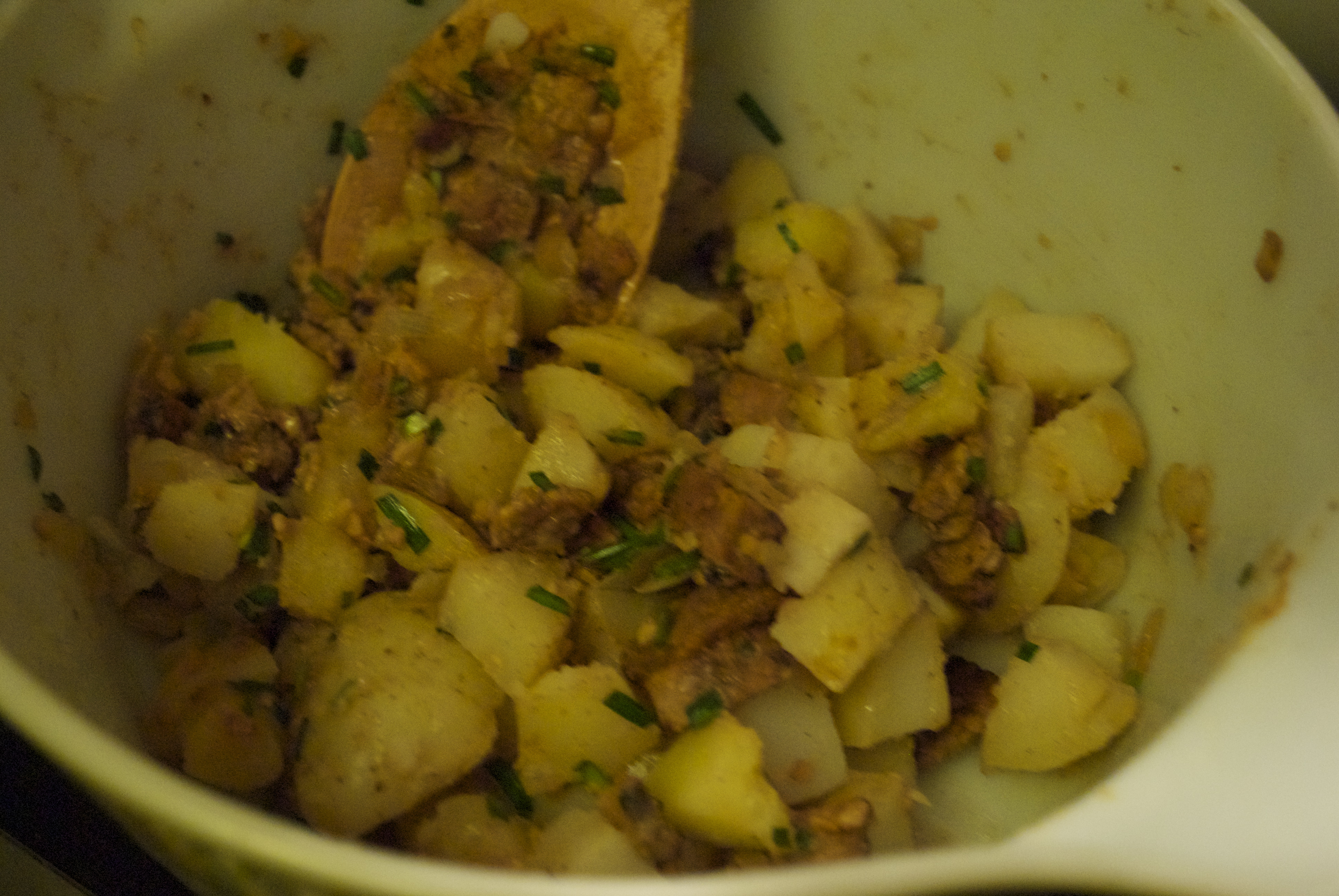 German Potato Salad w/ Tempeh Bacon. Nice and blurry. Chives were from my porch garden. Represent.