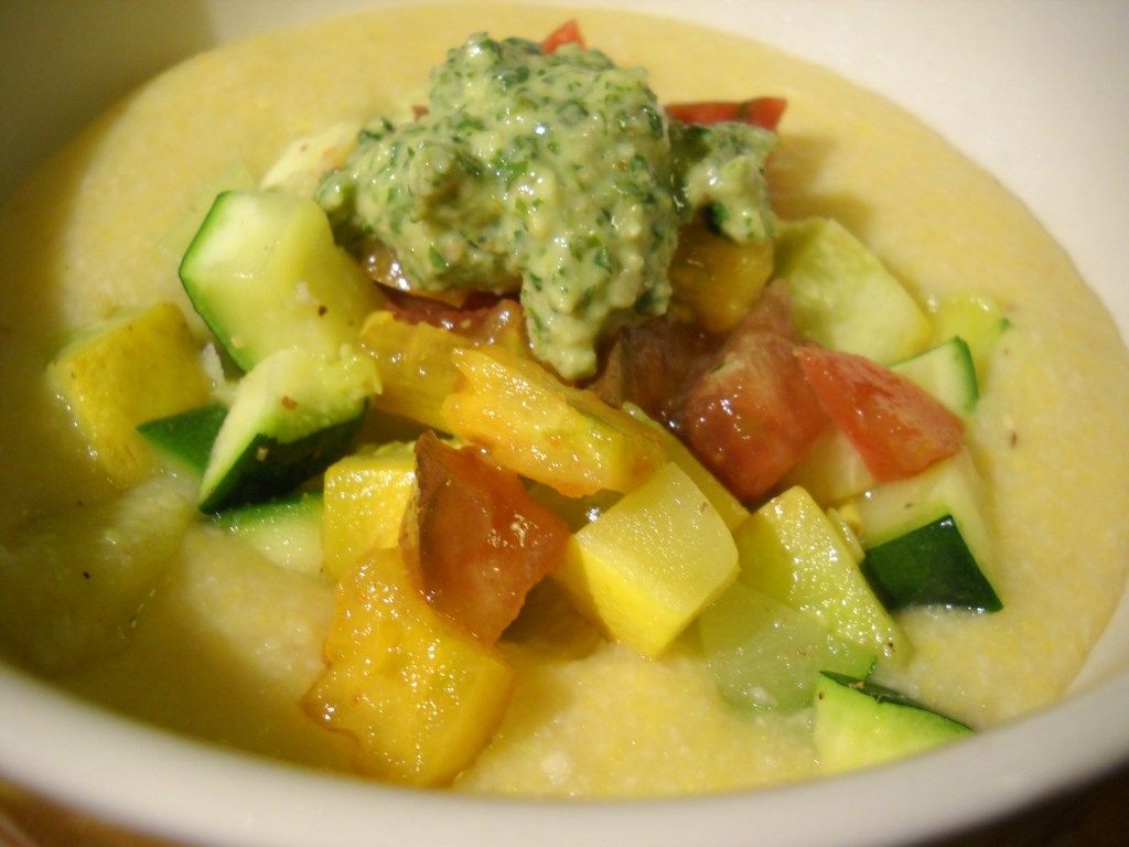 Velvety Grits with Sauteed Summer Squash, Heirloom Tomatoes, & Parsley-Walnut Pesto