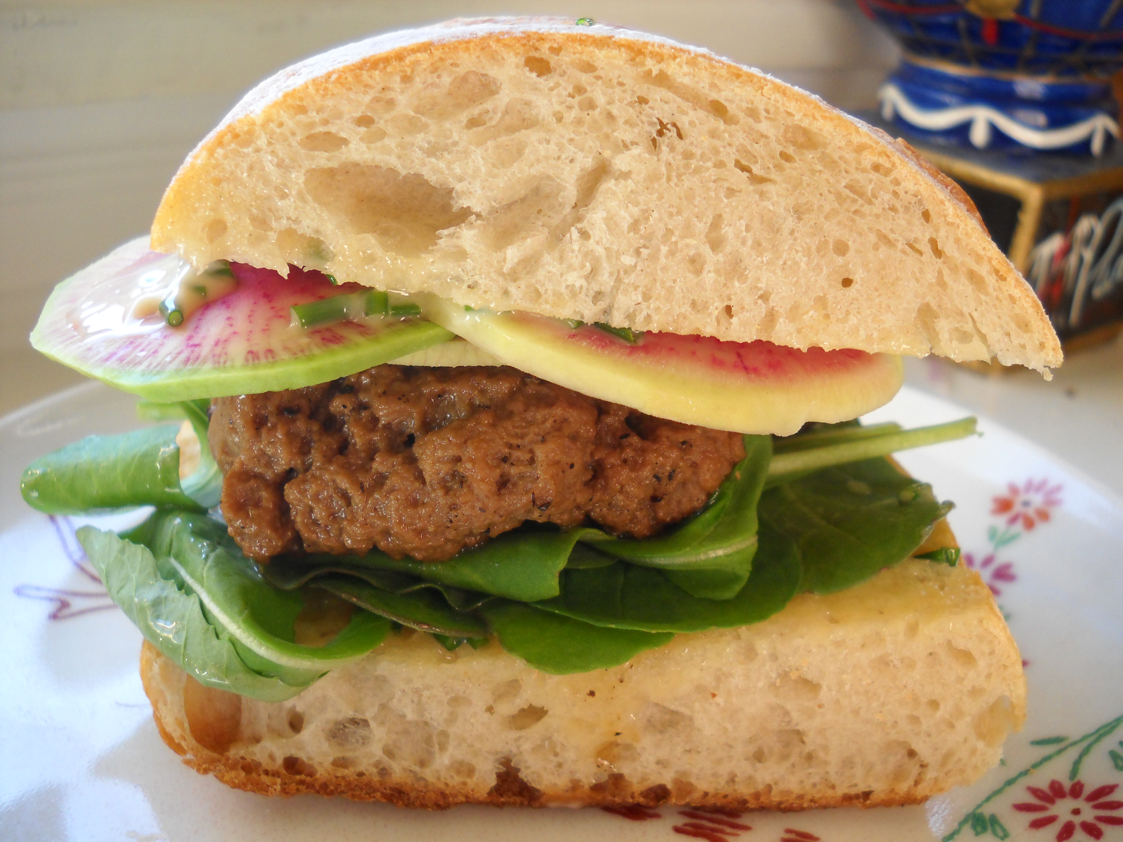I read that watermelon radishes make a nice topping for steak sandwiches. I made up some beef style seitan and whipped up some chive butter with Earth Balance and made myself a really satisfying sandwich.