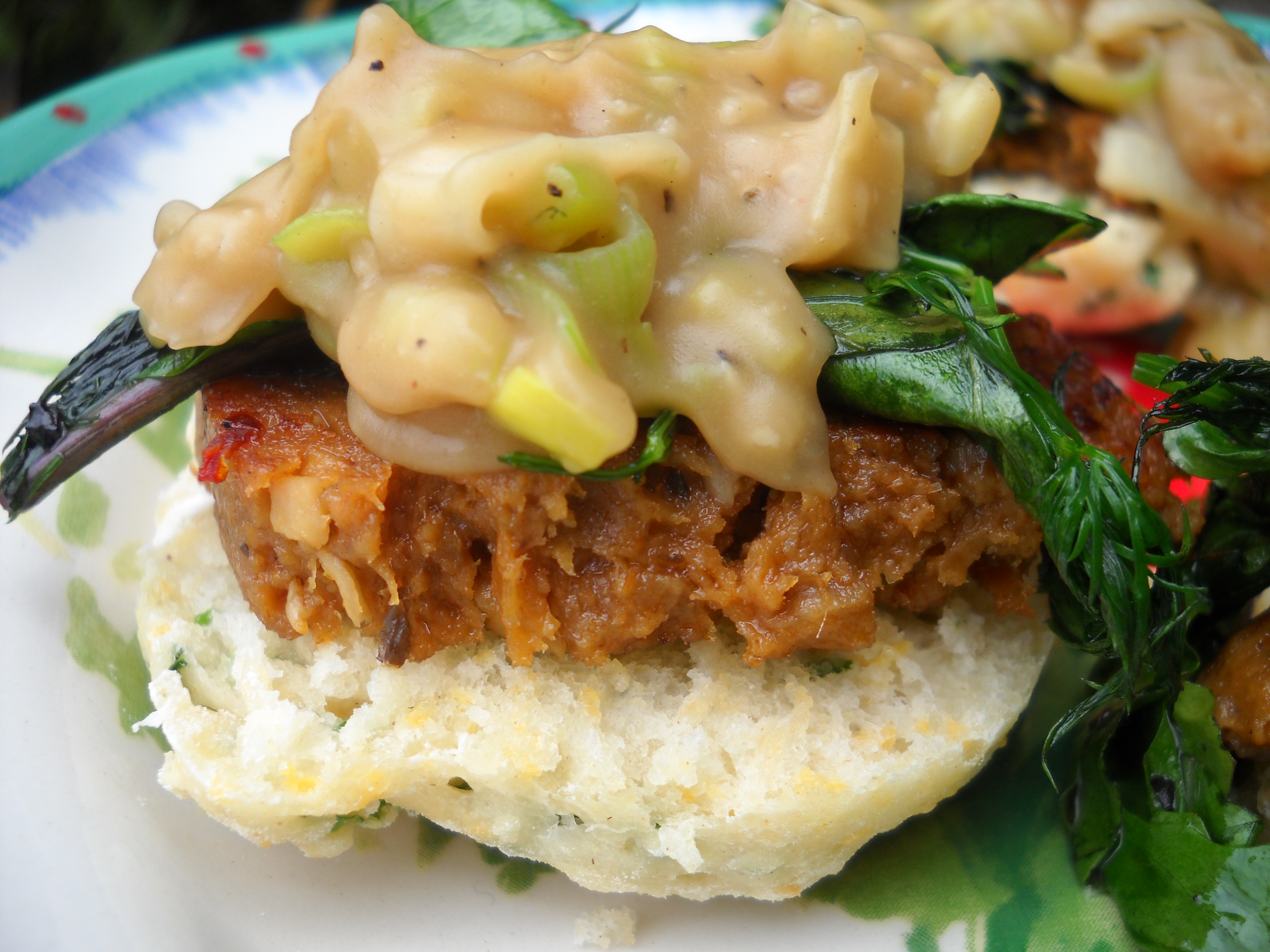 Lastly, I made a feast of Sausage & Beer Gravy over Cheddar, Green Onion, & Cilantro Buttermilk Biscuits w/ Fried Dill & Dandelion Greens