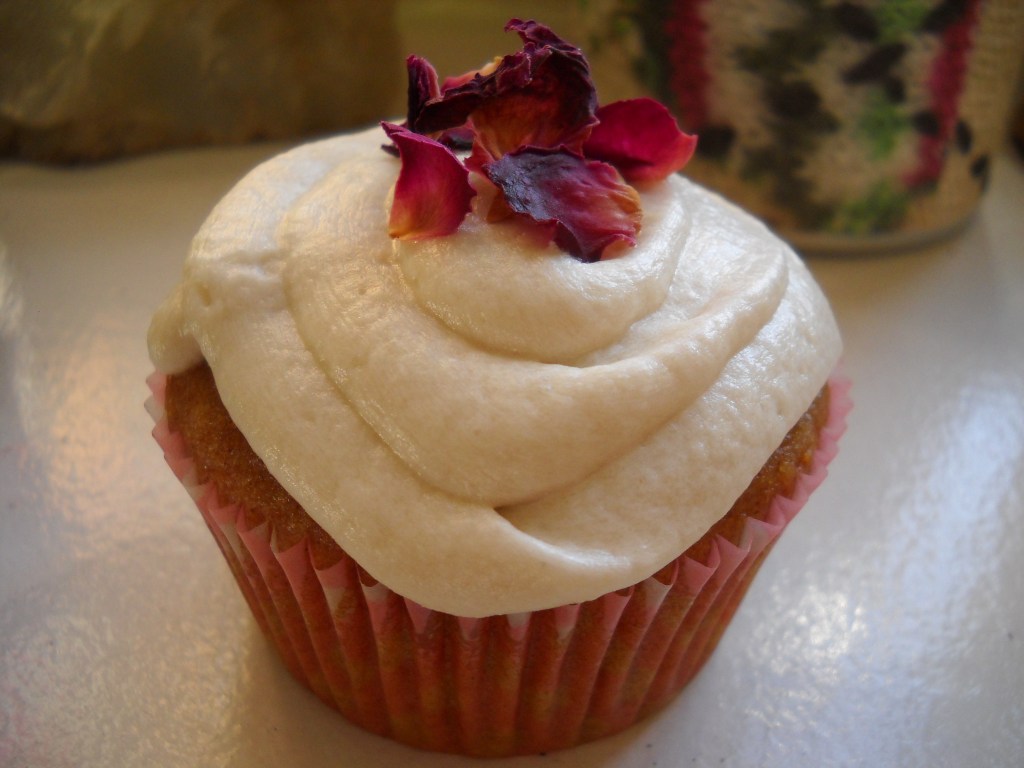 I’ve happened upon some time today and I thought I would come here to share the recipe for these cupcakes. I’ve never been much on Valentine’s Day, but I have found myself making treats suitable for that holiday. These Honey-Cinnamon Cupcakes with Rose fall into that category I think.