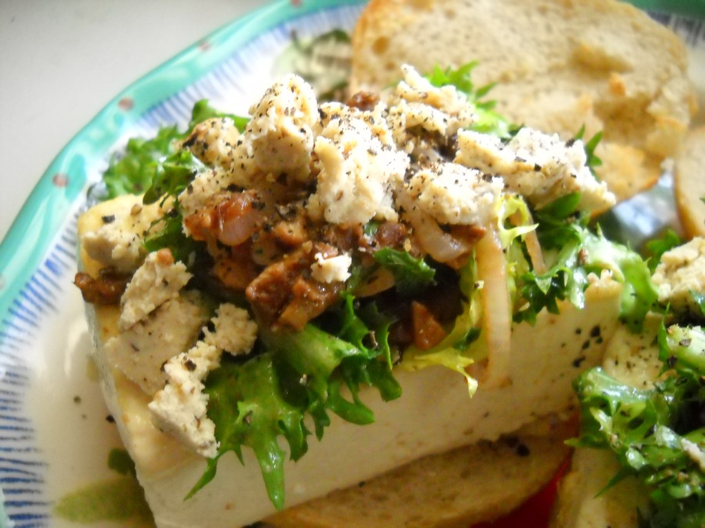 So. I was browsing around on this here internet giving a looksy at some of my favorite blogs. I went on over to Smitten Kitchen and saw Deb’s post about a fried egg sandwich with bacon and bleu cheese. And ya know, that sounded good to me. Real good. But, well, without the egg, bacon or bleu cheese. Ha….but seriously, a vegan version had to be made and so it went.