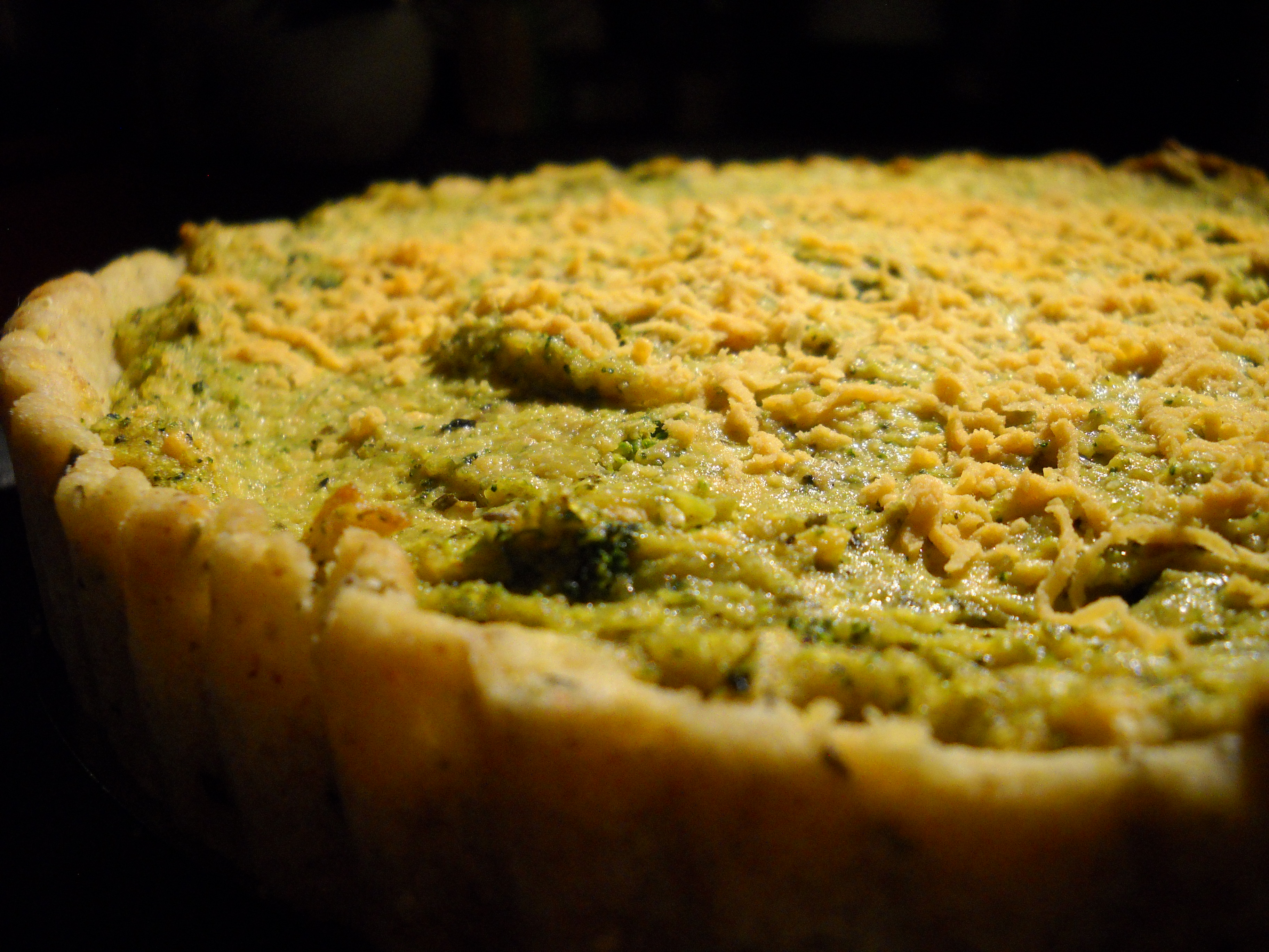 Now that that’s out of the way, I can’t believe that I did a post of broccoli and cheddar and forgot to talk about quiche. What….was I thinking…..As soon as I realized this terrible mistake, I immediately made a Broccoli and Cheddar Quiche. I used the filling recipe for the broccoli quiche in Vegan Brunch, but added some shredded cheddar style Daiya. How much to add is up to you. I used a crust recipe from the amazing Spork Sisters. I love their quiche crust recipe because it is relatively low fat compared to other crust recipes. Most recipes will basically have you make pie dough, with two whole sticks of Earth Balance etc. The Spork recipe just has a small bit of oil and a couple of other secret ingredients that make it delicious.